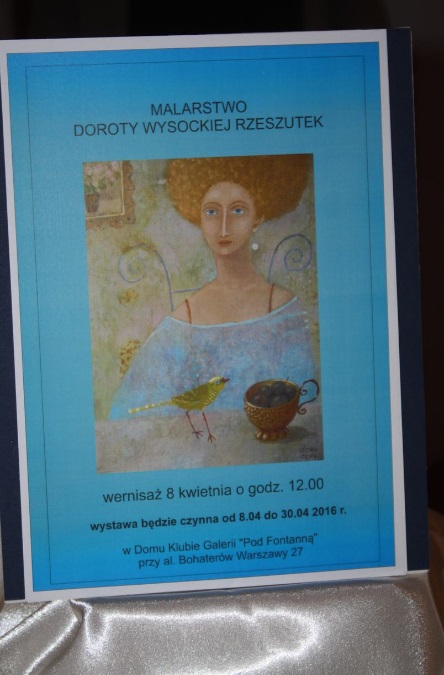 W dniu 8 kwietnia 2016r. w Galerii Pod Fontanną odbył się wernisaż wystawy Malarstwa Pani Doroty Wysockiej Rzeszutek.